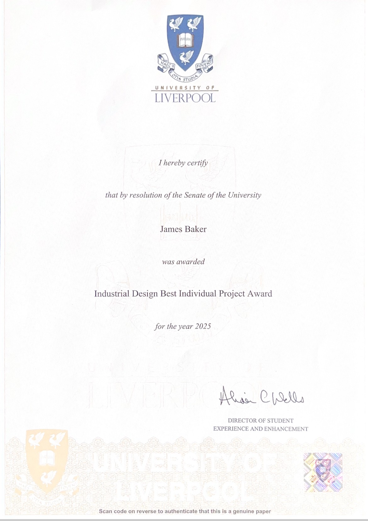 At the 2025 Graduation Award Ceremony I was awarded best Industrial Design Project at a grade of 87%, 17% over a first class grade of 70%, and contributing to a 1/4 of my overall final year grade as a 30 credit module containing a dissertation report, product design, build and test, and product presentation.